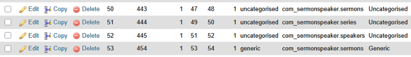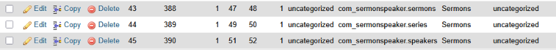 I copied over the Category and Asset_ID tables from the backup so they match the copied SermonSpeaker tables, still no sermons showing in the Backend. When I click on "Sermons, Series, Speakers Categories" menu items I get the following at the very top of the screen on the Backend: